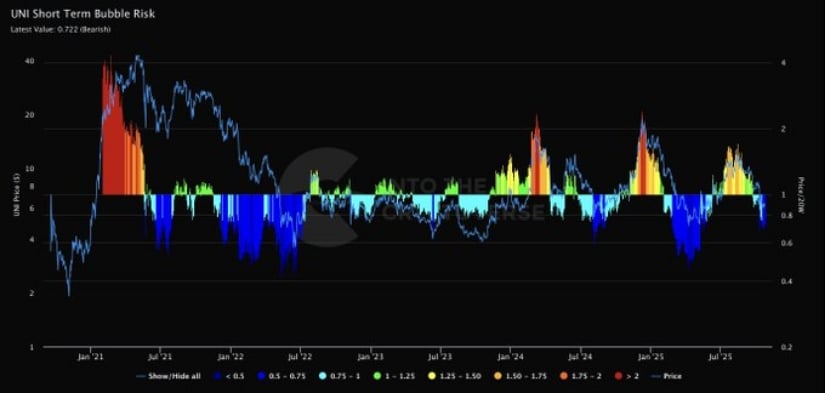 Into The Cryptoverse の常に勤勉な人々によると、Uniswap の短期バブル リスクは 0.722 というかなり平凡な水準にあります。そうそう、親愛なる皆さん、それは明らかに弱気です。貧弱なトークンは依然として20週間の単純移動平均(SMA)を大きく下回っており、これは私たちが過度の熱狂的で投機的なFOMOの領域に入るにはほど遠いことを示す信頼できる兆候です。歴史的に、1.25を超えるバブルリスクは、急激な調整や急落など、破滅の前兆でした。逆に、マイナスの数値は通常、世界の終わり(または少なくとも一時的な売られ過ぎ状態)を示しますが、仮想通貨の世界では、これは実質的に市場操作者へのラブレターです。