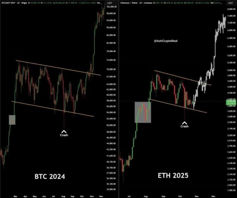 市場の狡猾なキツネであるカムラン・アスガー氏は、X に「イーサリアムはビットコインのブーツを履いて歩いている。このパターンが当てはまれば、12 月までに 7,000 ドルから 8,000 ドルが見られるだろう! 誰がそれに乗る準備ができているだろうか?」と書きました。風向きは変わるかもしれないが、観衆は歓声を上げる。 🐐