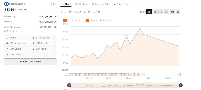 生意気なトリックスターであるチェーンリンクは、太陽光線を守る猫のように 18 ドル付近でくつろいでいます。この数字は単なる値段ではありません。それは秘密の隠れ家であり、魔法のドアであり、「押し倒してはいけない」壁です。そして、何だと思いますか?現在、18.10ドルで取引されているが、これは基本的に、トークンが「挑戦すらしていないのに、まだ勝っている」ということを示している。 🏰✨