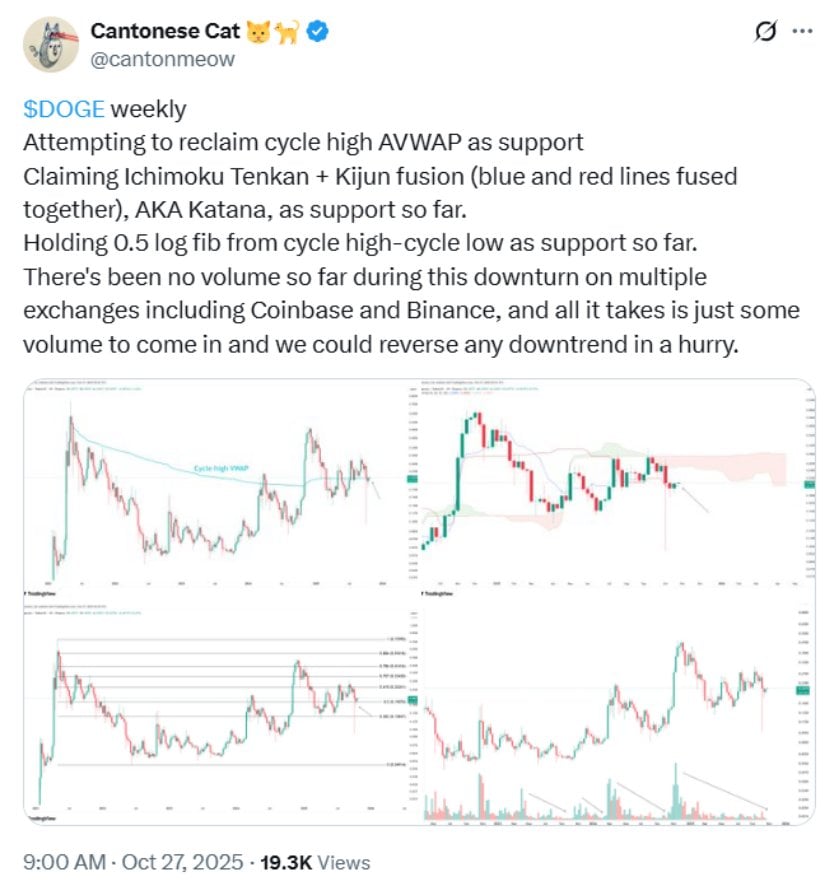 The Tradableのサード・ウラー氏は、DOGEは街灯柱にしがみついている酔っぱらった船員のように、0.19~0.20ドルの「フィボナッチの要塞」にしがみついていると主張した。 🌊 取引量が急減しても、絵の具が乾くのを見るのが好きなら、コインの回復力は「感動的」です。 「必要なのは、ささやかな熱意の注入だけです。そうすれば、この居眠り祭りは花火大会に変わります。」とウラーは喉を鳴らします。