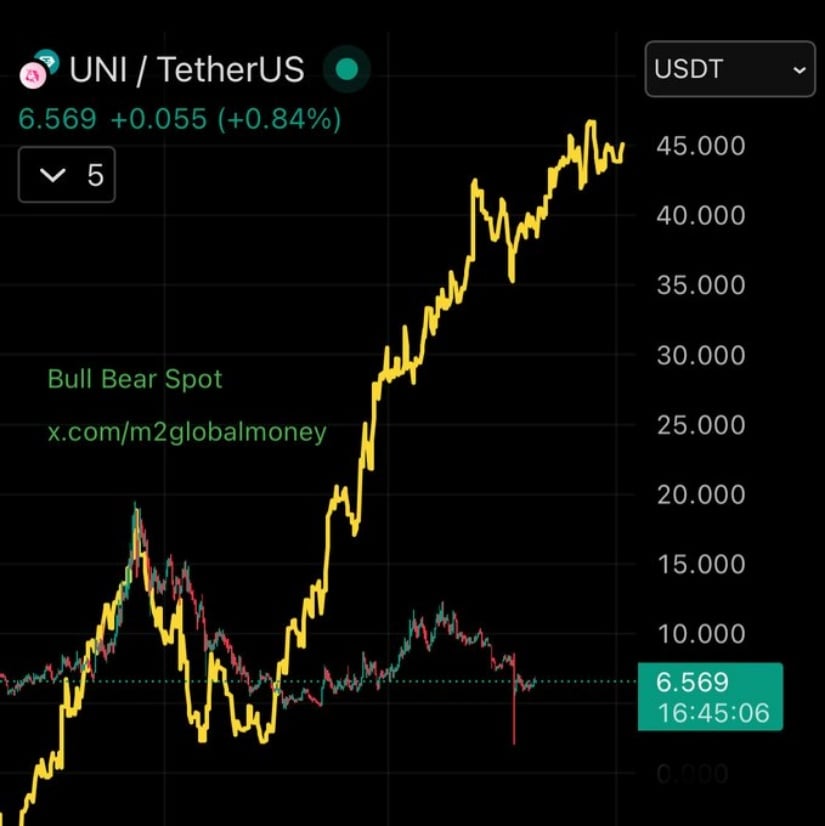 最近、経済面で風見鶏に相当するブル ベア スポットの賢明な賢者たちが、魅力的なチャートを公開しました。この記事では、控えめな小さな Uniswap を、最も熟練した会計士でさえ目を曇らせるほどの巨大な M2 マネーサプライと比較しています。 15 兆ドル未満から 45 兆ドルを超えるまで、誰かが無限の現金の蛇口をひねったようなものです。歴史的に見て、水門が開くと、リスク資産、つまり仮想通貨や株、さらにはいとこが口うるさく言い続けるあの1枚のコインさえも、シャンパンの中で揺れるコルクのように上に浮き上がるように見えます。あるいは彼らはそう願っている。
