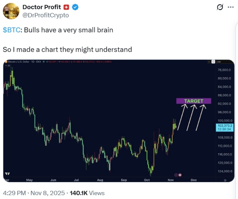 2025 年 11 月 9 日の時点で、この有名な BTC は 101,800 ドルで売られていますが、その価格は経験豊富なランボ所有者でさえ赤面するほどの高額です。この回復は、オスカー・ワイルド自身が真珠を握りしめたであろうほど劇的な変動の一週間を経てのことだった。 99,376ドルでちょっとした浮気?市場の道化師による単なるいたずらです。本当のオチは?大ハンマーのような繊細さを備えた雄牛が王座を取り戻しました。