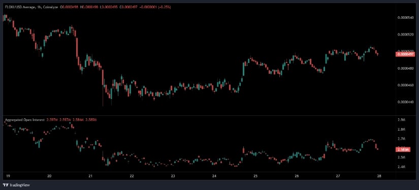 短期的な価格変動は、激しいパーティー後の二日酔いのように、初期の急激な下落の後、FLOKIがゆっくりと回復していることを示しています。トークンは、上昇を試みる前に、0.0000470 ドルから 0.0000480 ドルのゾーンから反発しました。 1時間足チャートの構造は不安定な下落から一貫した安値形成へと移行しており、短期参加者のセンチメントが改善していることを示唆している。それにもかかわらず、0.0000500ドルレベル付近の価格動向は明らかな拒否反応を示しており、買い手が勢いを抑えている近くの供給ゾーンを突破するのに苦労していることを示唆しています。 🚧