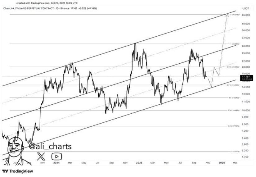 著名なアリ氏は、X への手紙の中で、見事なまでに簡潔にこう宣言した。「15 ドルの下落でお買い得品を確保し、46 ドルで利益を満喫してください。」彼のチャートは、よく練られた結婚契約書のように、壮大な上昇チャネルを描いており、賢明な女性が社会の慣習を遵守するのと同じように、トークンが支持線と抵抗線を粘り強く尊重する様子が最も喜ばしいことです。 😏