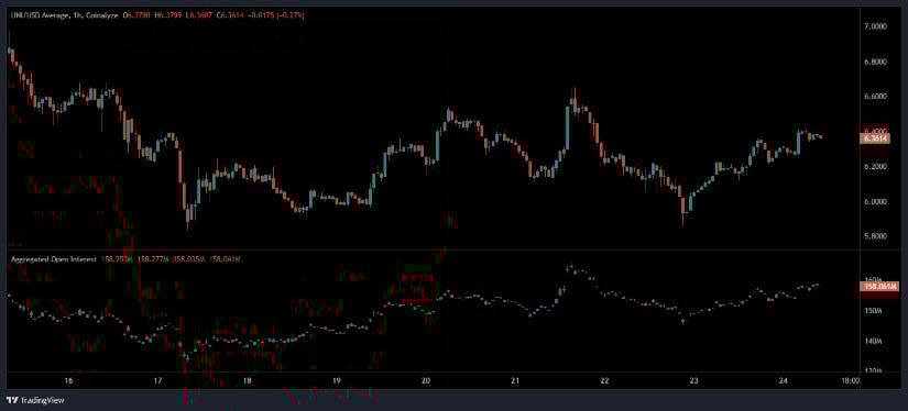 「市場は賢くなってきているのか、それとも混乱に飢えているのか?」の最新エピソードでは、UNI の建玉 (または OI – 誰もが良い略語を好むため) が 10 月中旬以降、約 1 億 5,000 万ドルから 1 億 5,800 万ドルまで少しずつ上昇しています。そのため、どうやらトレーダーたちはキーボードを武器に、手っ取り早く一銭も儲けることを夢見て、再びゲームに熱中しているようだ。建玉で価格が上昇するときは、2 人の友人が熱心に岩を上り坂で押しているようなもので、刺激的ですが、あまりにも強く押しすぎると差し迫った破滅の暗示を伴う傾向があります。 🚀🧗‍♂️
