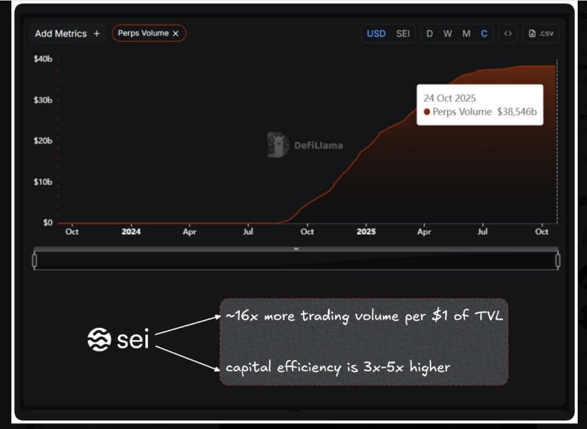 常に賢明な Nick Research によると、sei ネットワークは常にその首を高く掲げており、トータル バリュー ロック (TVL) 効率で 4 位の地位を獲得しています。あのデジタルゴシップコラムの DeFiLlama は、その永久取引高が 2025 年 10 月 24 日までに 380 億ドルに急増したことを明らかにしています。TVL がわずか 6 億ドルで、3 ドルから 5 ドルの間で低迷している洗練されていない同業他社と比べ、1 ドルあたり 16 倍の取引量を処理しています。なんて恐ろしい中産階級なんだ! 🧐