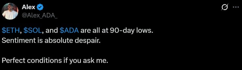 ADA のコミュニティ心理は安定しつつあり、アナリストのセセビ氏は大きな危険信号を振っています。このレベルでの売却はリグレットビルへの片道切符です。チャートは、ADAが下降構造をすり減らしていることを示していますが、売られ過ぎの状況と下値の勢いの弱まりは、新たな弱気の暴れではなく、枯渇を示唆しています。 🏃♂️💨 会話はパニックから蓄積へと移りつつあり、長期投資家やアナリストは、カルダノの鋭いサイクルではトレンドがリセットされる直前に最も深い下落が見られることがよくあることを皆に思い出させています。 🌪️🔄