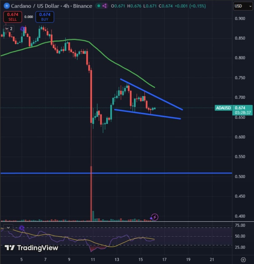 4時間足チャートでは、ADAは下降ウェッジを形成していますが、これはワイルドのほのめかしと同じくらい暗示的なパターンです。 0.65ドル付近の下限はサポートとして機能し、トレンドラインの上部抵抗は0.70ドル付近で推移しています。出来高が大きく0.70ドルを超えて終値をとれば、ブレイクアウトが確認され、0.75ドルから0.78ドルへの道が開かれる可能性がある。ブルズにはまだダンスカードが残っているようだ。 💃🔥