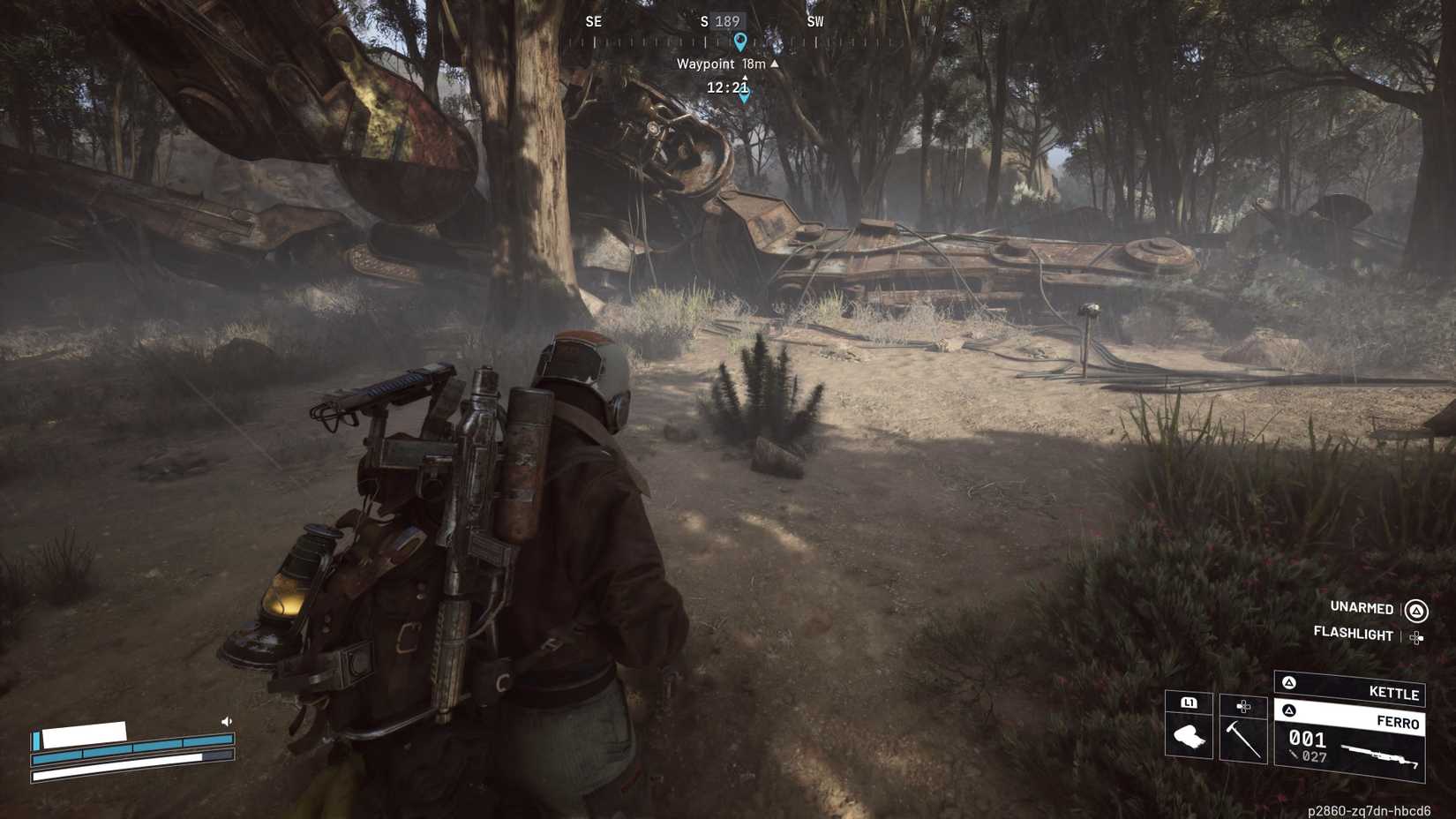 残骸を見つけたら、なくなったヘルメットを探します。それは画面に表示される茂み、つまり中央の茂みの中に隠されています。茂みまで歩いてヘルメットを拾うだけです。