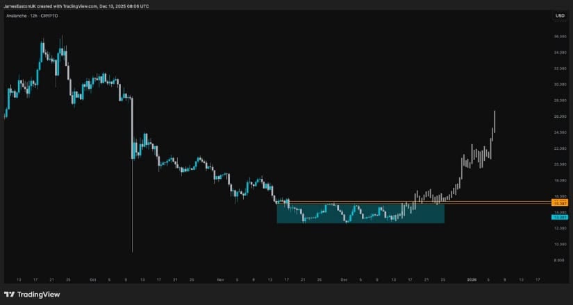 見よ、尊敬されるジェームス・イーストンのチャートだ。彼はチョッキの好みと同じくらい鋭い分析をする人物だ。彼は、最近衰退したスイス時計の精度を統合した AVAX を紹介します。同氏は、15ドルの水準が運命の境界線であり、これを突破すると市場構造の地殻変動が起こる可能性があると指摘する。緊張が高まるにつれ、群衆のあえぎ声が聞こえてきそうです。 🎭
