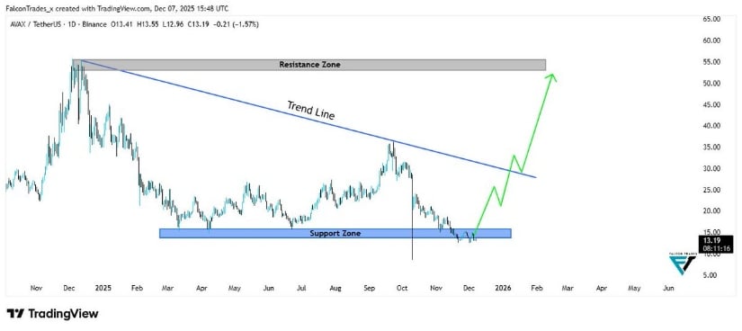 12月中旬の時計が近づくと、AVAXは13ドルという控えめな価格で存在感を示し、かつての栄光とは程遠いが、ワイルドの機知よりも回復力があることが証明された需要ゾーンを断固として上回っている。友人の皆さん、このゾーンは、舞踏会で失神するビクトリア朝の女性のような優美さで売り圧力を吸収し、複数の時間枠にわたって構造的な下限として繰り返し機能しています。かつてドラマの女王だった価格は、下落加速を拒否して数週間かけて値固めを続けており、弱気派にとっては非常に残念なことだ。 🐻