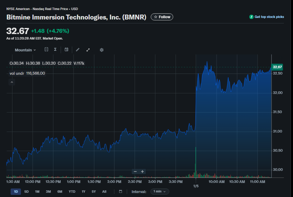 金融追求という壮大なタペストリーの中で、奇妙な物語が展開します。それは、最近 32,977 という驚異的なイーサリアム (ETH) を調達した BitMine Immersion Technologies の物語です。この大胆な行動は投資家の熱狂的な注目を集め、おそらくコーヒーブレイクの手を止め、十分に餌を与えた猫が木に登る優雅さで株価が上昇するのを信じられない様子で見つめたのだろう。報道によると、この買収は2025年の終わりの熱狂のさなか、多くの人がまだ休暇の贅沢から回復しているであろう時期に行われたという。