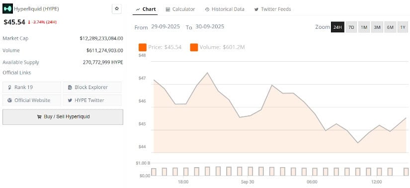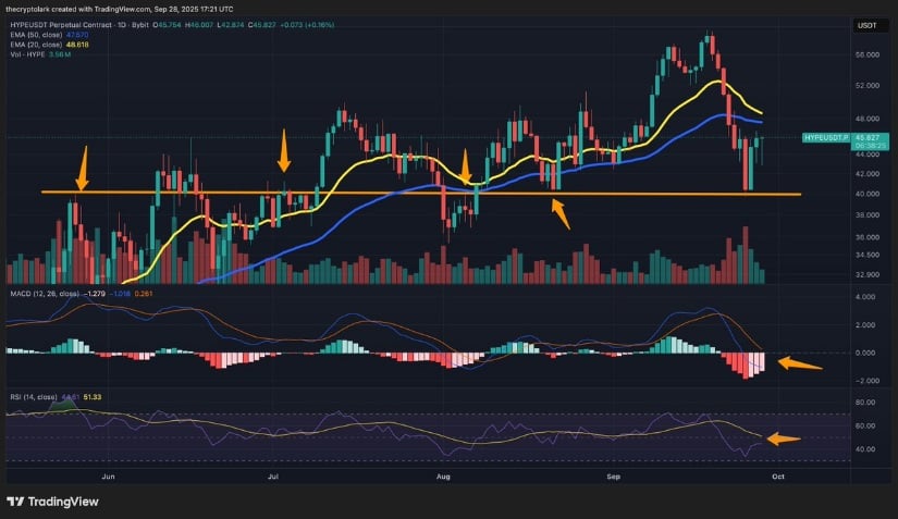 Crypto Dance FloorのMercurial SpriteであるHyperliquidは、最近、同様に退屈な2人の求婚者の間で引き裂かれたデビュタントのように、その支援ゾーンとレジスタンスゾーンの間で激しく飛び回っています。価格は、退屈なディナーのゲストとは違って、スフレが崩壊したり、市場の上位参加者がドゥアの弱気チャートと運動量指標のかすかでありながら持続的な浮気の間の悲劇的な決闘に巻き込まれたりするかどうかは不明ではなく、約45ドルを増やしています。