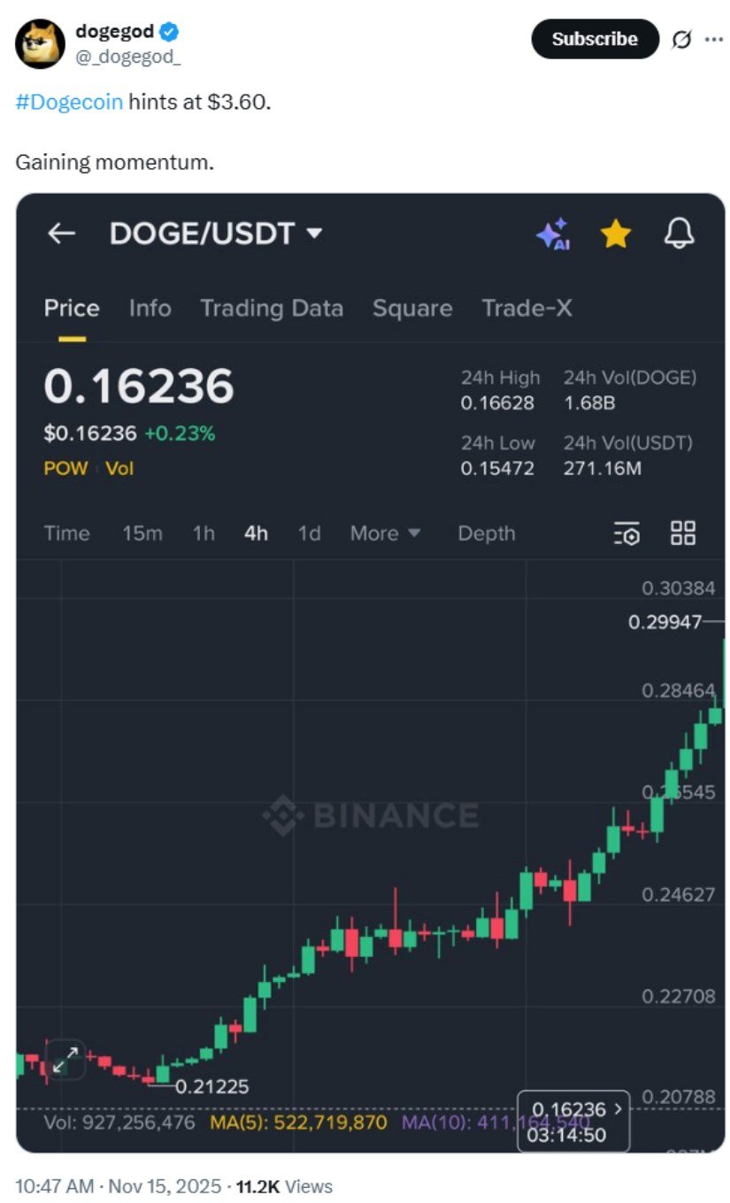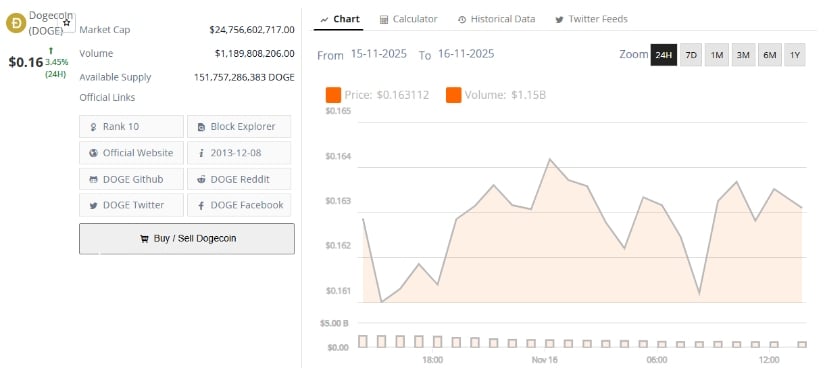 こうして、2025年11月16日、資産の中で最も謎に満ちたデジタルコイン、ドージコインは0.16ドルという微々たるもので推移し、まるでつかの間の繁栄の亡霊をつかもうとする必死の試みであるかのように、その日当たりの出来高は増加している。しかし、投機の喧噪の中で、3.60ドルの急騰のささやきが物乞いの空虚な約束のようにこだまする一方で、テクニカル指標や歴史的パターンに対する冷たく譲れない視線は感動することなく見つめ返している。仮想通貨の嵐を乗り越える疲れた魂である投資家たちは、責任の重荷で心を重くしながらも、混乱の中で慰めを求めて、トレンド、サポート、レジスタンスというまさしく支柱に執着している。 🐕💸🧠