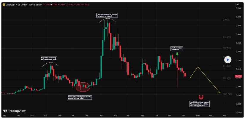 かすかな希望の光にもかかわらず、リスクが大きく迫っています。暗号資産の知恵を裁定するアリ・チャートは、0.16ドル以下のサポートは乞食のマントのように薄く、流動性ギャップは0.073ドルに向かって広がっていると警告している。この脆弱な糸を失うことは、迅速かつ無慈悲な降下を招くことになります。さらに、その気まぐれな仲間であるドージコインの価格は、多くの小売トレーダー、市場の謙虚な奉仕者にとって、仮想通貨のより広範な潮流、特にビットコインのパフォーマンスを反映することが多く、その方向性を決定している。 🐕📉