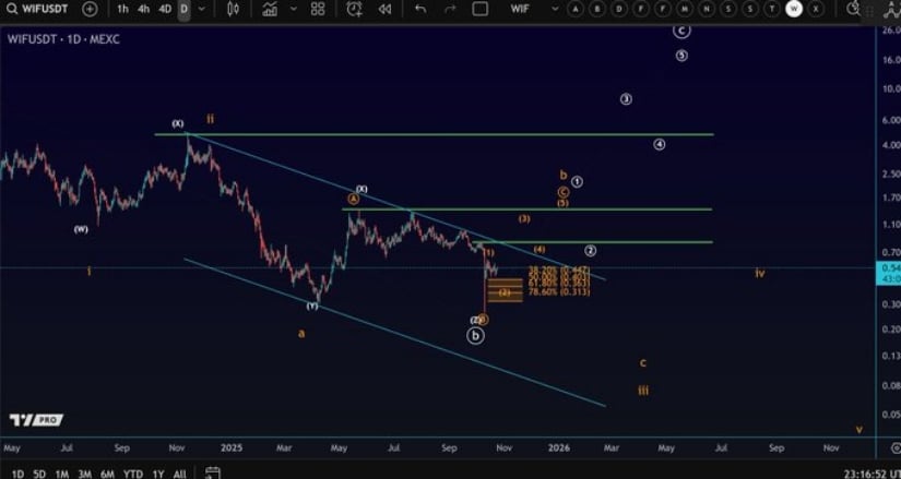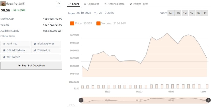 BraveNewCoin は、Dogwifhat が 0.81% 反発の 0.56 ドルで取引されていると報告しています。これがピークの 1.32 ドルの半分にも満たないという事実がなければ、もっと興味深い話になるかもしれません。時価総額が5億5,600万ドルで、小さな池を埋めるほどのボリュームを持つこのトークンは、暗号通貨の壮大なオペラの中では脇役にすぎない。その供給は? 9 億 9,800 万枚のトークンは、クジラを満足させるには十分ですが、不足の神を怒らせるほどではありません。 🐳