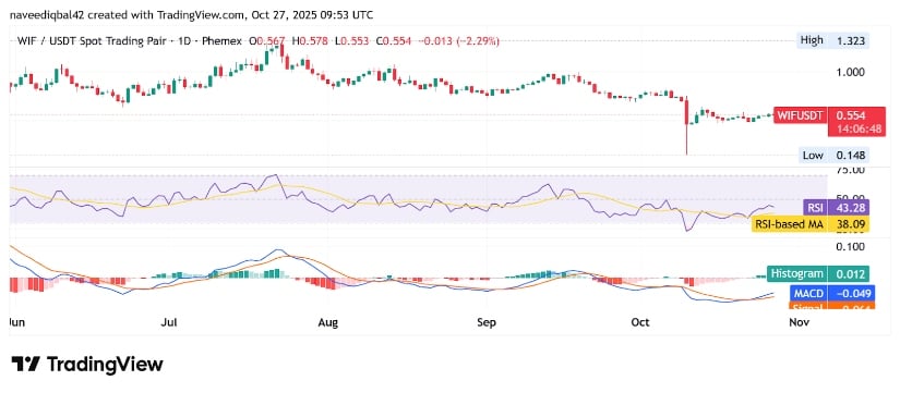 WIF/USDT は今日 1.94% 下落して 0.556 ドルで取引されています。仮想通貨であってもフリーランチなどというものはないからです。日次グラフは、睡眠不足の学生が教科書の余白に落書きしているのと似ています。 RSIは43.50で推移しているが、トレーダーを眠らせてしまうほど当たり障りのない数字だ。 MACD?まだ信号線を下回っていますが、少なくともヒストグラムはもう泣いていません。 📉