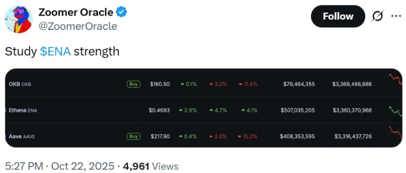 取引記録はENAの相対的な活気を明らかにしています。 OKXでは2.9%上昇し0.493ドルで値上がりし、出来高は5億700万ドルでOKBやAAVEなどを上回っている。 10 月 21 日のチーム拡大とカルデラの統合後、コミュニティの精神は楽しそうに踊ります。楽しい。