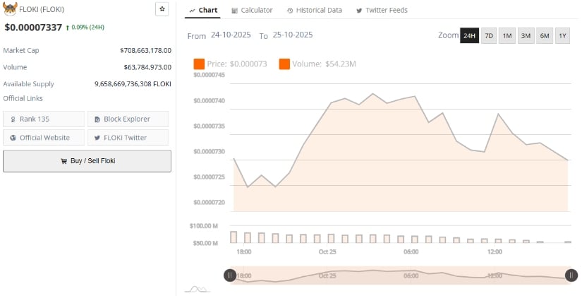 私たちの時代の神託である BraveNewCoin は、FLOKI の現在の価格を 0.00007337 ドルと報告しています。これは 24 時間でわずか 0.09% の上昇です。その時価総額は 7 億 860 万ドルという巨額であり、6,378 万ドルの取引高に支えられています。 9 兆 6,500 億のトークンが流通しているこのミームコインは 135 位に固執しており、これはその回復力、あるいはおそらくその頑固さの証です。 🏋️♂️💪