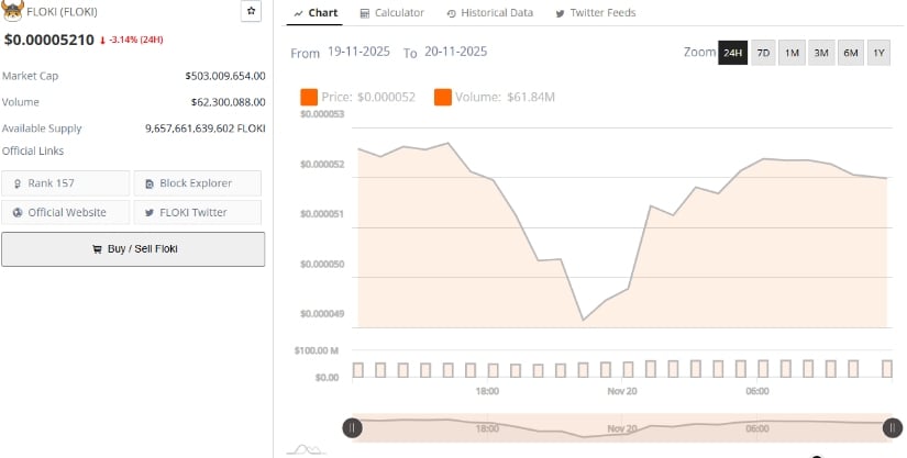 真実の前兆である BraveNewCoin は、FLOKI の最新の屈辱を報告しています。24 時間で 3.14% 下落し、0.00005210 ドルのままです。ああ、この数字の皮肉ですね! 3.14、仮想通貨市場という無限の苦しみの輪を思い出させます。時価総額 5 億 300 万ドル、取引高 6,230 万ドルの FLOKI は、すべての不条理の記念碑として立っています。そして、9兆6,500億の流通供給量を忘れてはなりません。この負担は、最も強気な精神さえ押しつぶされかねないほど大きな負担です。 📉💔