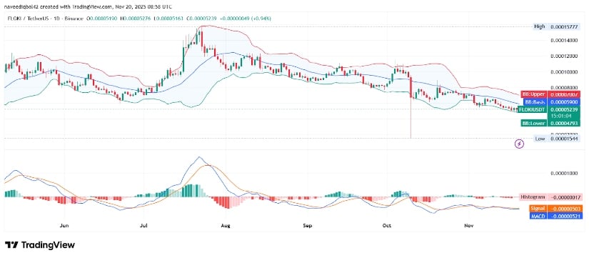 ここでTradingViewの日足チャートに目を向けると、FLOKIの惨状が明らかになります。価格は0.00005248ドル付近で推移しており、日中の上昇率はわずか1.12%に過ぎず、全体的な下落傾向を隠すことはほとんどありません。ボリンジャーバンド基準の0.00005900ドルを下回ると、自身の弱さの虜になっている。そして、0.00004795ドルの下のバンドにしがみついていますが、ここには救いはなく、売られ過ぎの状況を冷たく受け入れるだけです。 🌀❄️