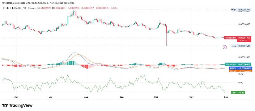 日足チャートでは、FLOKI の下降トレンドは私の悪い習慣よりも持続的です。高値も下がり、安値も下がり、年半ばのピーク以来の記録を更新した。現在、$0.00004700 から $0.00004900 の間でクラスター化されており、これは基本的に暗号通貨で肩をすくめるのと同等です。  ̄\_(ツ)_/ ̄
