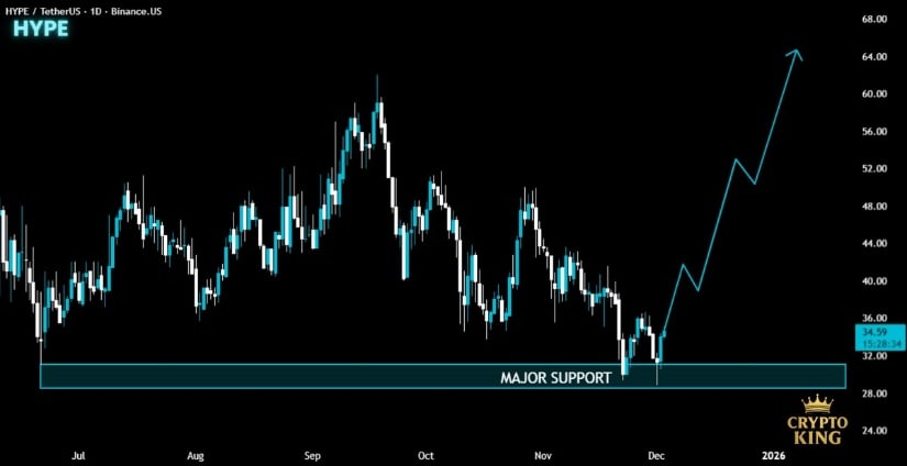 ビッグニュースは、基本的にチャート分析の王室であるクリプトキングからのものです。同氏は、HYPEが「主要なサポートゾーンを開拓した」と指摘しており、これは30ドルから32ドル付近のより広範な合流点と一致している。 🗺️ このゾーンは歴史的にバイヤーを惹きつけてきましたが、なんと、新たなバウンスを生み出しました。ローソク足の構造は最初の高値を形成しつつあり、これは仮想通貨での初回デートが順調に進んでいることに似ています。 💑 クリプトキングの予測は、出来高が一時停止しないと仮定すると、階段状に 38 ドル、45 ドル、52 ドルの流動性ポケットに戻ることを示唆しています。 😴