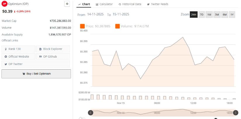 最新のBraveNewCoinアップデートの時点で、OPの価格は0.39ドルで、今日は0.29%下落しました。その時価総額 7 億 3,500 万ドルは、非常に混乱したオウムに尋ねた場合、私有の島に支払う金額とほぼ同じです。そして24時間のボリュームは? 1億4,700万ドル。ヨットを買うには十分ですが、沈む感覚から逃れるには十分ではありません。仮想通貨界のランク130位?まあ、少なくともそれが最後ではない。まだ。 🏴☠️