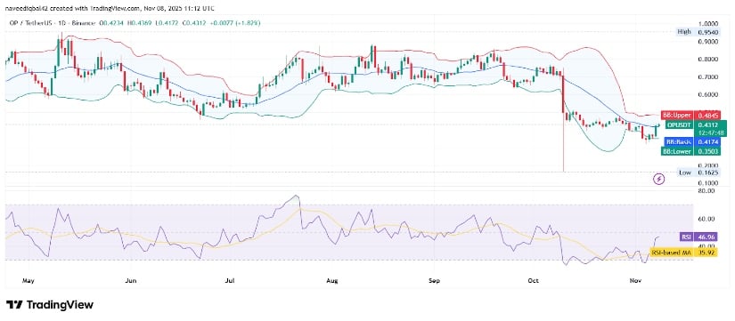 最近の X の投稿で、数人のトレーダーは、OP が最近の安値から回復したことは、売り圧力の低下と、割引水準付近に位置する買い手の関心が高まっていることを示していると強調しました。議論では、買い手が短期的な下落を繰り返し擁護してきた構造的な需要ゾーンとして、0.40ドル付近の価格帯が強調された。この動作は、市場が降伏から安定化に移行する統合段階でよく見られます。 🎉