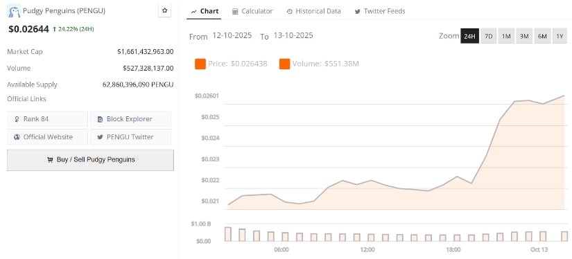 Pudgy Penguins の PENGU は先月、これほど極端な変動を経験しました。30 日間の活動期間内で 40% の勢いで行動しました。ああ、人間の無謀な傾向です。現在、それは0.0150ドルの絶壁のすぐ上、0.0224ドル付近に位置しており、この場所は何度も消極的な復活の床として機能してきた。あたかも市場はその無限の愚かさゆえに、冗談に抵抗できないかのようだ。 🙃