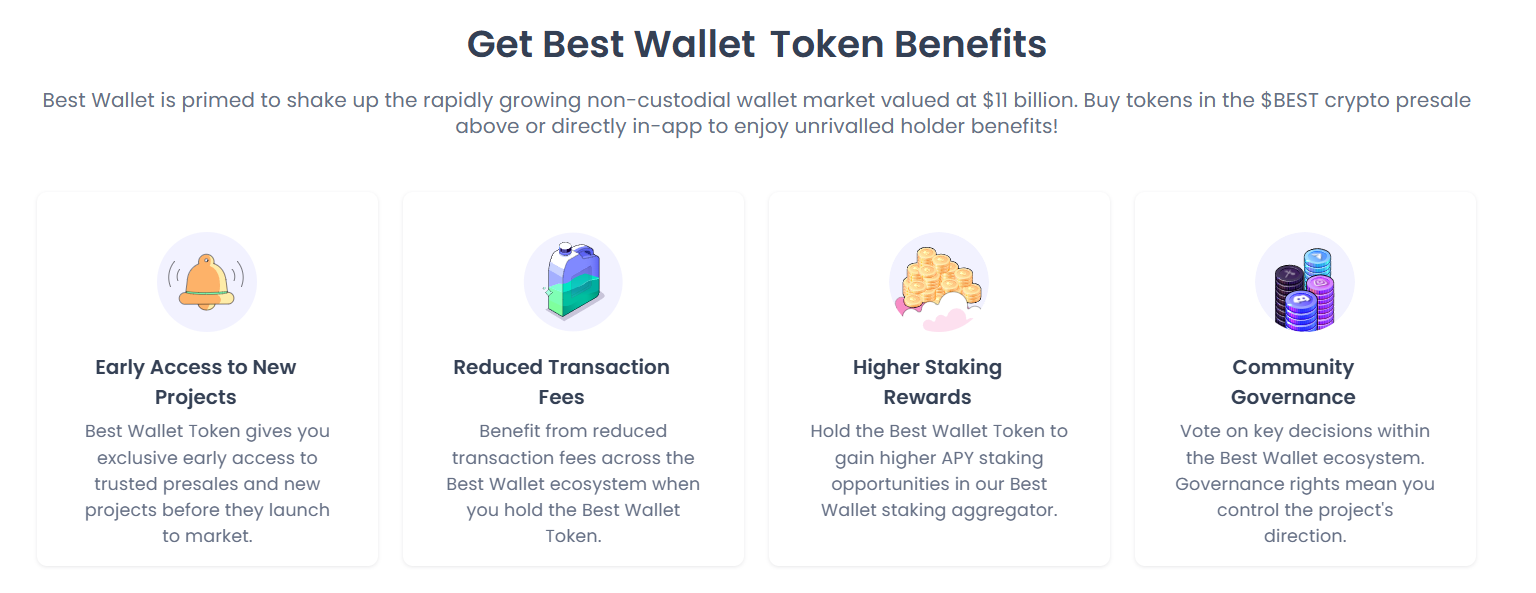 この次世代ウォレットの世界の中心となるのはベスト ウォレット トークン ($BEST) で、プレセール中に今購入すべき最も人気のある暗号通貨の 1 つとして浮上しています。トークン所有者は次のような豪華な特典を受けられます。