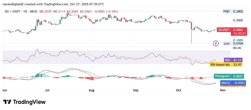 現在、SEI は 0.2082 ドルに落ち着いており、その日の上昇率はわずか +0.63% でした。日足チャートはついに0.19ドルのサポートレベルからわずかに上向きの動きを示しており、 トレンド反転の可能性を示しています。 0.21ドル付近での値固めは、おそらくSEIが「ちょっと待って、まだ終わってないよ」と言っているだけだろう。 😎