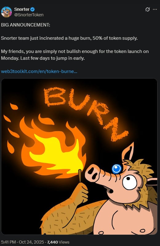 当初、$SNORT は固定の 5 億の供給を監督していましたが、英雄的なやり方で、息をのむような 2 億 5,000 万のトークンを燃やした後、知事がそれを半分にスライスするという英雄的な行為が見られました。これは、飢えたドラゴンの尻尾を切り落とすのと並行した経済行為です。 🐉