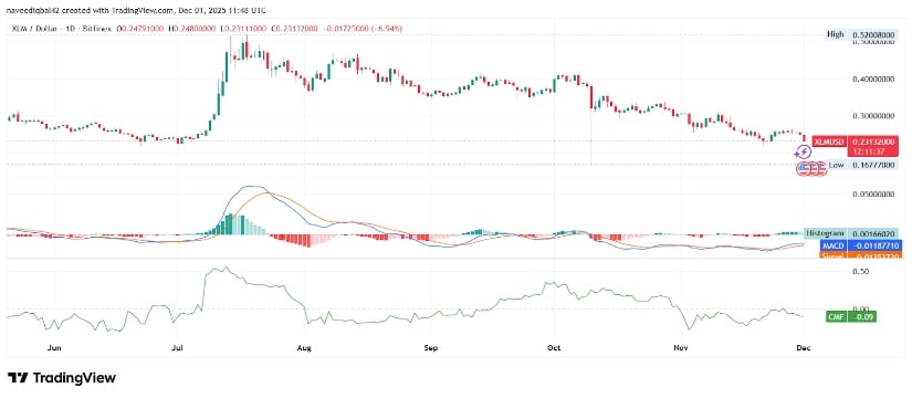日足チャートは、年半ばに最高値を記録したコインが、その後、月への休暇を取ることを決めた物語を物語っていますが、帰りの航空券を梱包するのを忘れていた点が異なります。 7月以来、ステラは壊れたメトロノームのように、より低い高値とより低い安値を形成し続けています。 🎵