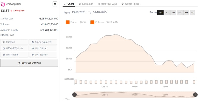 BraveNewCoin は、UNI が 6.57 ドル、24 時間で 3.11% 下落し、時価総額は 39 億 5,000 万ドルであると報告しています。 41 位にランクされているのは、雨漏りする屋根を持つ王国の DeFi 王です。流動性?ダイエットソーダのように薄い。しかしまあ、少なくともそれはまだリストの最後ではありません。 🏆😅