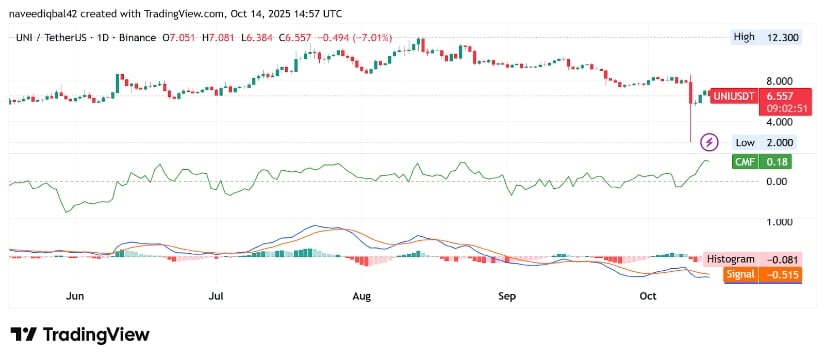 UNI/USDは、あたかもトークンが生きる意志を持っていたことを思い出したかのように、時間足チャートで1.34%反発の6.61ドルにしがみついている。気まぐれな建玉は1億4,900万ドルから1億4,800万ドルに減少し、レバレッジを過剰に高めたトレーダーの大量流出を示唆した。彼らは今、「押し目買い」神話を信じているのか、それともただ生き残るためにパンを買っているだけなのか、疑問に思う人もいるだろう。 🍞