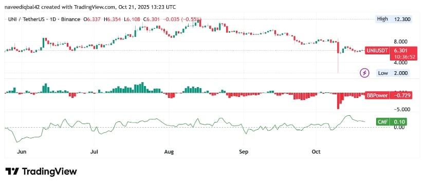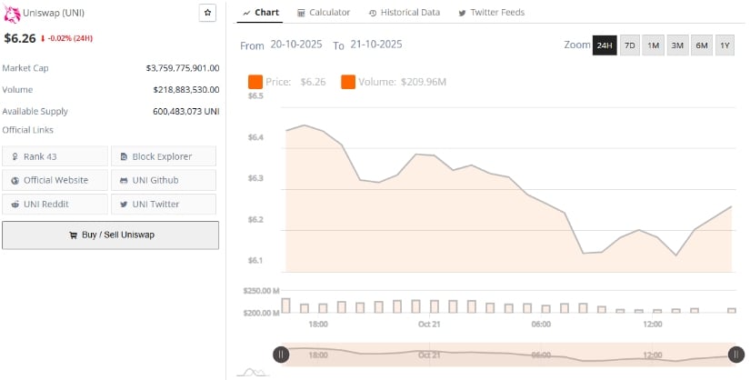 BraveNewCoin は、Uniswap の時価総額は 37 億 5,000 万というささやかながら、43 位にランクされ、まるでシェイクスピアの悲劇の脇役のようだとささやきます🎭。 1 日あたりの取引量は 2 億 1,880 万件とわずかで、1 日あたり 0.02% の減少ですか?ジェットコースター 🎢 に疲れた人にとっては、安堵のため息です。