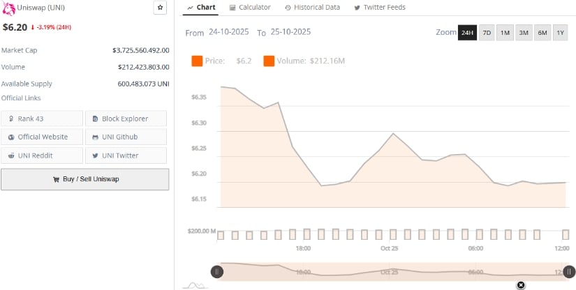 「What’s Up with Uniswap」の最新エピソードでは、現在の価格は ~ 6.20 ドルで、過去 24 時間で約 3.19% 下落しました。時価総額は2億1,200万ドルの24時間取引高に支えられ、誇らしげに37億2,000万ドルに達しています。これは小さな島や非常に高級なコーヒーマシンを購入できるほどの額です。流通供給量は6億48万トークンで、暗号通貨教室で43番目に人気のあるトークンとなっている。 📉🤓