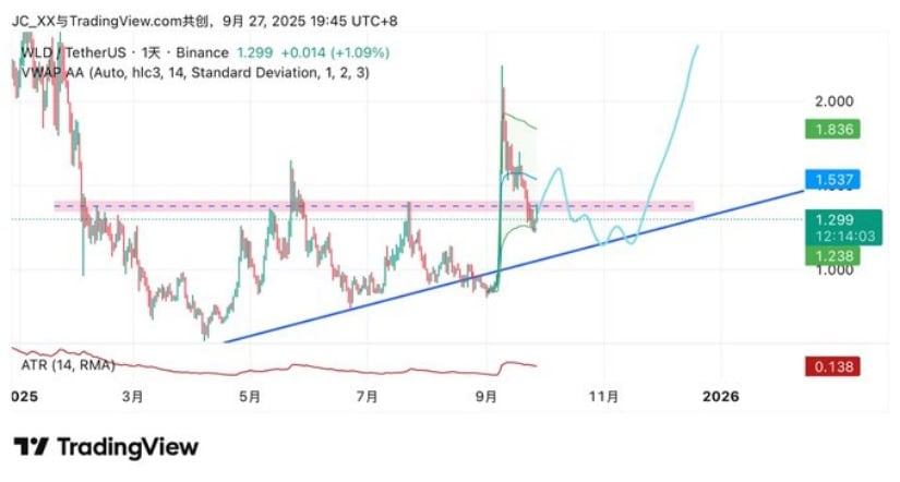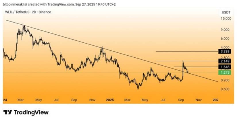 彼のチャートは、2024年からの下降トレンドがまだ「影響力がある」ことを明らかにしています。これは、「このラインは悲しいトロンボーンのように見えます」という暗号コードです。今月初め、WLDは退却する前に抵抗を2.14ドル前後にテストしました。明らかに、コインでさえバスルームの休憩を取る必要があるからです。 🚽