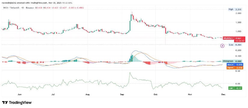 日足チャートがそれを裏付けています。このトークンは、9月の誇大広告のピークである2.20ドル以来、ゆっくりと下降しています。今では、最高値も最低値も低くなり、悪くなるばかりのひどい散髪のようなものです。現在の約0.62ドルから0.63ドルという居心地の良い価格レンジは、回復というよりは、市場が成長したときにどうなりたいのかを理解するのを待つことです。 😅
