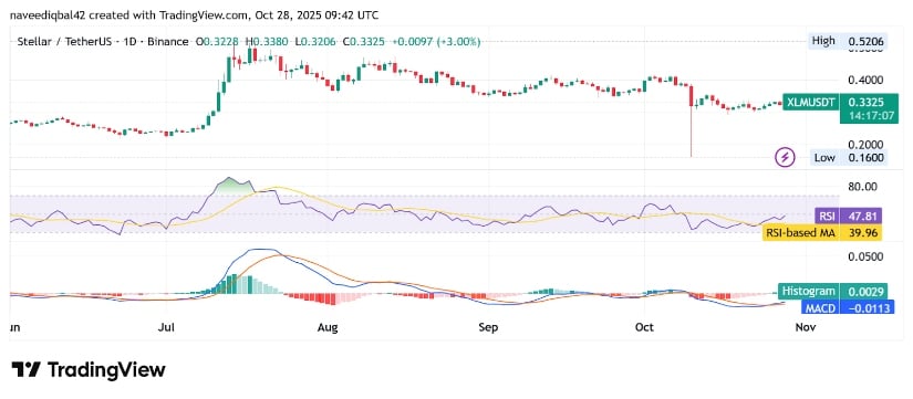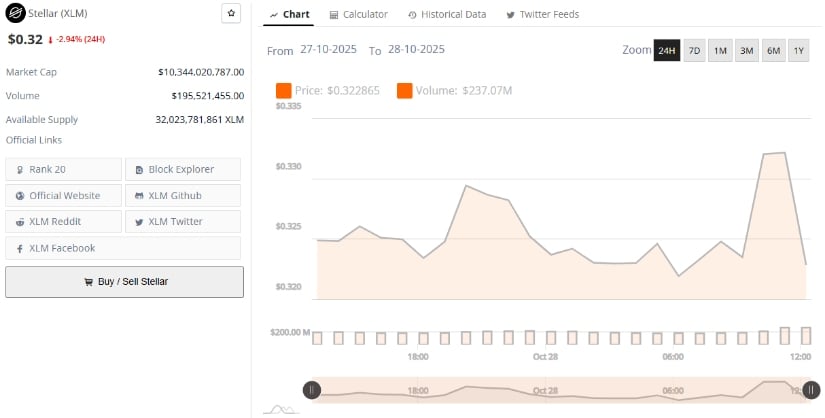 BraveNewCoin と呼ばれる全知の神託によると、XLM は 0.32 ドルで堅調ですが、怒り狂った十代のような振る舞いをしており、過去 24 時間で 2.94% 下落しています。時価総額は103億4,000万ドルに膨れ上がり、1日の取引高は約1億9,552万ドルに達しており、この資産は基本的に中級デジタル資産年鑑の中で最もクールな存在だ。 💼