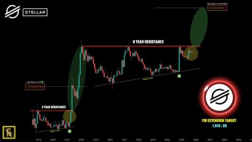 テクニカルアナリストのChartNerd氏(「徹夜でローソク足を眺めていた」と叫ぶ名前)は、星が水瓶座の月と一致した場合、フィボナッチエクステンションでXLMが8.32ドルに達する可能性があることを示唆するチャートを共有した。分析では現在の構造を2017年の上昇相場と比較し、「酔っぱらいが山に登るように」高安値を築いている上昇トライアングルに注目した。 XLMが0.50ドルを超えた場合、価格発見フェーズがトリガーされる可能性があります。あるいはクラッシュするかもしれません。未来は謎の中に謎に包まれた謎。 🤔