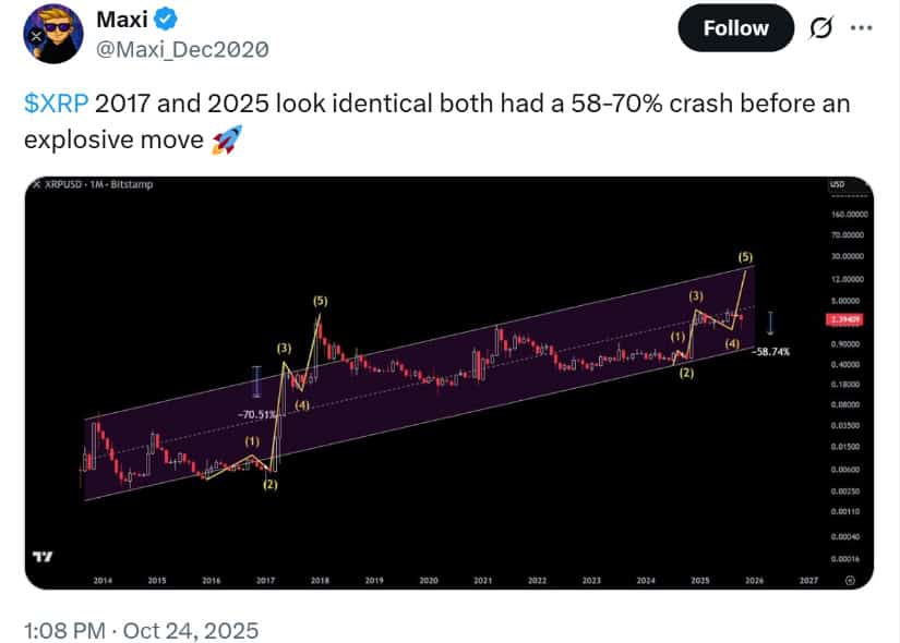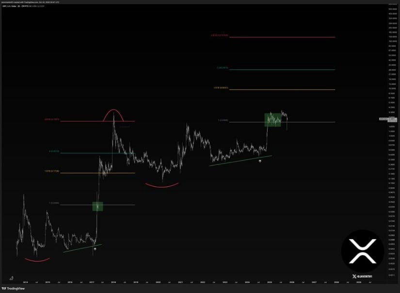 今、誰もが XRP を 2017 年と比較しています。JavonTM1 はアーチとトレンドラインを含むチャートを持っており、9.90 ドルを予測しています。それは 300% のジャンプです。もちろんです、1 月 🙄 でも、もしそうなったら、帽子を食べてしまうでしょう。 🧢 別のアナリストは、「2017 年と 2025 年は同じに見える!」と言っています。なぜなら、歴史は繰り返されるからです。 🤔