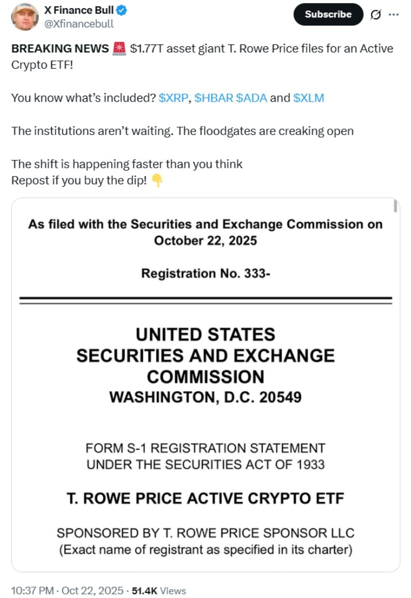 1兆7,700億ドルの巨人、T.ロウ・プライスは自社のETFにXRPを入れたいと考えている。 HBAR、ADA、XLM とともに。最後に、制度上の愛も! 💖 しかし、先走ってはいけません。 ETF はユニコーンのようなものです。誰もがそれについて話していますが、まだ誰も見たことがありません。 🦄