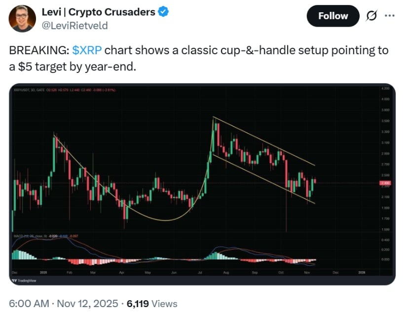 チャートを読む神秘家であるアナリストたちは、あたかも星に書かれているかのように「古典的なカップとハンドルのセットアップ」を指摘します。彼らは、2.40ドルを突破すると、XRPは年末までに5ドルにまで急上昇する可能性があると言います。でも音量確認?それは、不確実性の中で焼かれたケーキの上のチェリーです。 🎂