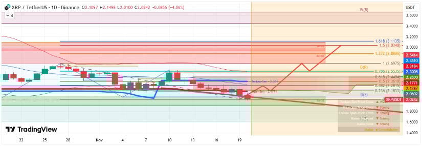 技術的な観点から、アナリストは 2.02 米ドルから 2.06 米ドルの間で主要なサポートを監視しています。このレンジは歴史的に、調整後に買い手が介入するフロアとして機能してきました。当面の抵抗線は2.17~2.18米ドル付近にあり、0.236フィボナッチリトレースメントレベルと最近の安値からの下降トレンドラインの両方と一致している。日次終値がこの範囲を上回る場合は新たな勢いを示す可能性があるが、拒否された場合はさらなる値固めを促す可能性がある。 🧮🌀