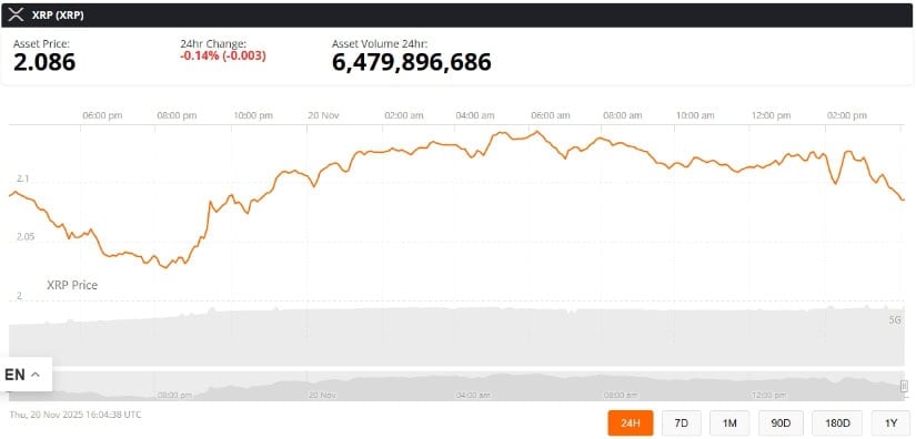 ETFの立ち上げ時点で、XRPは約2.08ドルで取引され、24時間で約0.14%下落し、取引高は約64億8000万ドルに達した。 📉💰